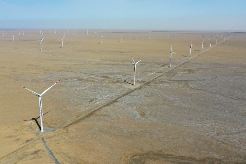 这是在新疆巴音郭楞蒙古自治州若羌县拍摄的新天绿色能源股份有限公司新天若羌县罗布庄10万千瓦风电项目(2025年6月27日摄,无人机照片)。新华社记者 丁磊 摄