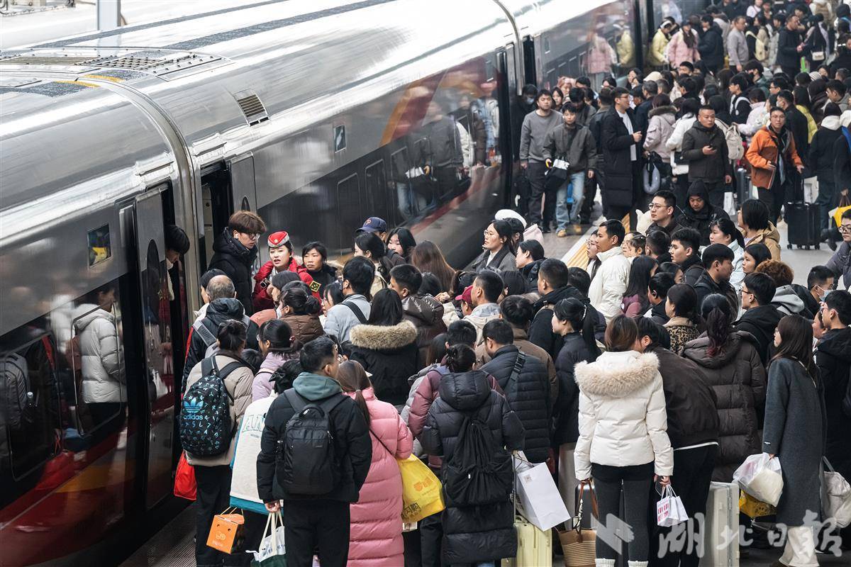 1月3日,汉口火车站迎来返程客流高峰,旅客有序乘车。(湖北日报全媒记者 任勇 通讯员 宋萍 席珊珊 摄)