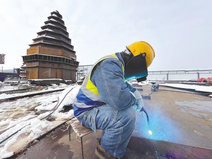 1月1日,兴发保谷磷化工产业园项目建设现场,杨充平正在焊接制作黄磷电炉炉渣处理装置所用的钢板。(湖北日报全媒记者 周升蕾 摄)