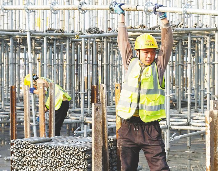 1月1日,襄阳楚能项目工地上,工人们正搭设支模架。(湖北日报全媒记者 吴宇睿 摄)