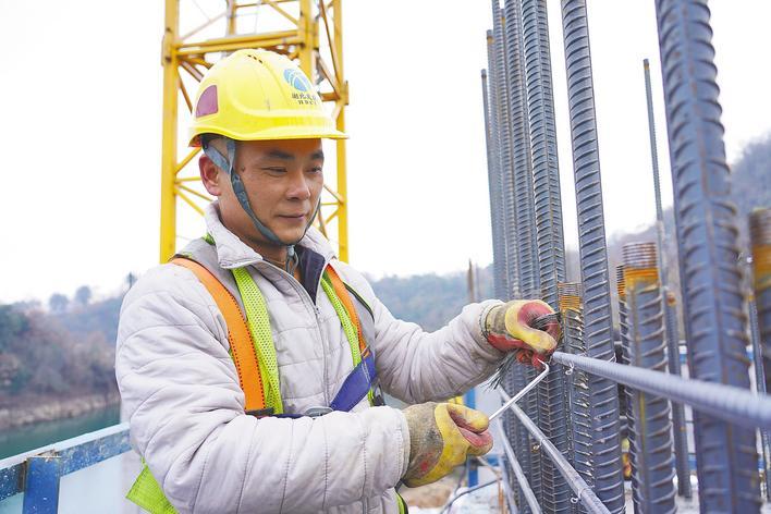 平宜高速襄阳段云台山水库大桥6号桥墩上,钢筋绑扎工张海兵专注地进行着钢筋绑扎作业。(湖北日报全媒记者 祝兆林 摄)