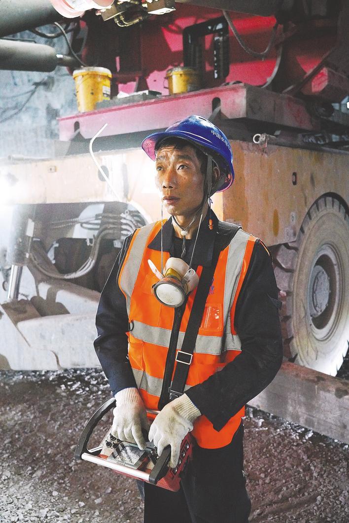 张家坪抽水蓄能主机厂房施工现场,李武贵操作双滑臂电脑凿岩台车进行钻孔作业。 (湖北日报全媒记者 祝兆林 摄)