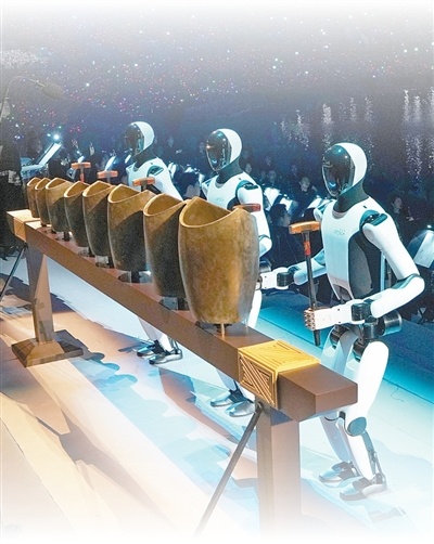 第十五届全运会开幕式上,智能人形机器人敲响盛行于春秋战国时期的乐器青铜句鑃。新华社记者 李一博摄