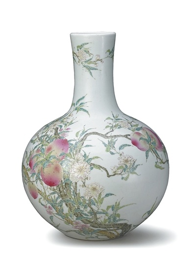 2025年10月10日,故宫博物院迎来建院100周年。图为“百年守护——从紫禁城到故宫博物院”展览展出的粉彩九桃图天球瓶。故宫物院供图