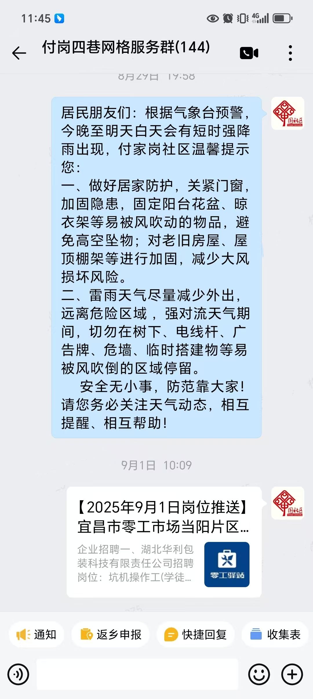 “各位居民请注意,预计未来 6 小时将出现强降雨天气,请注意关好门窗,远离低洼地带……”每当气象部门发布预警信息,付家岗社区的居民微信群、公众号便第一时间响起提示音,网格员还会对独居老人、残疾人等特殊群体进行点对点逐一告知。为确保预警信息全覆盖、无遗漏,社区还构建起“线上+线下”的立体预警网络:线上依托数字化平台实现预警信息“秒级推送”,让居民第一时间掌握天气变化;线下组建“社区干部+网格员+志愿者”巡查宣传小队,深入小区楼栋、沿街商铺,将天气预警和防护知识送到群众身边。2024年2月当阳突发极端大雪天气,社区通过居民群提前发布预警提示,提醒群众减少外出、注意防滑,有效保障了群众出行及居住安全,赢得居民广泛好评。