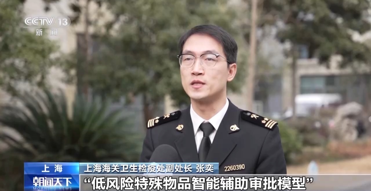 上海海关卫生检疫处副处长 张奕:推出全国首个“低风险特殊物品智能辅助审批模型”,在把控生物安全风险的前提下,将平均审批时长压缩了70%。