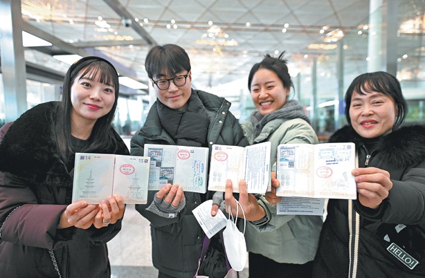 韩国游客在北京首都国际机场展示护照上的入境印章。(图片来源:新华社)