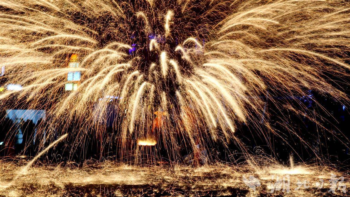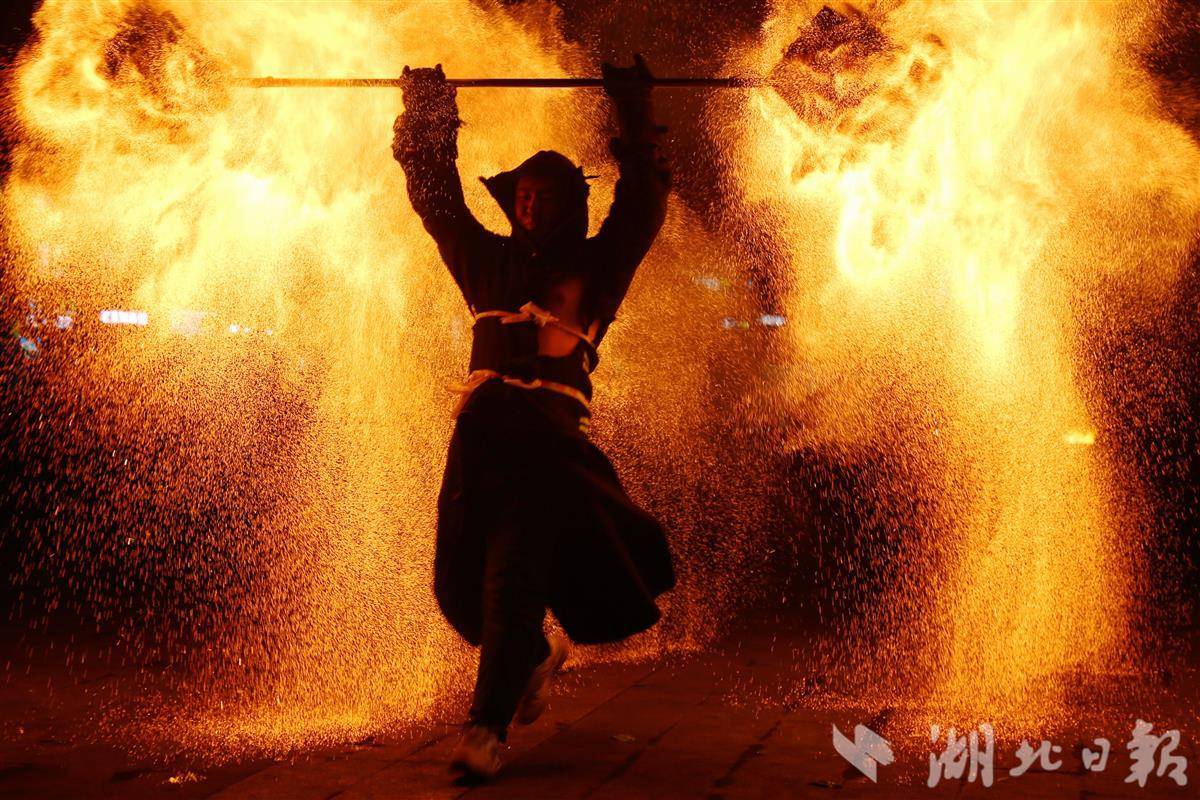 1月4日晚,在十堰市郧阳区新天地文化广场,民间艺人表演非遗“打铁花”。
