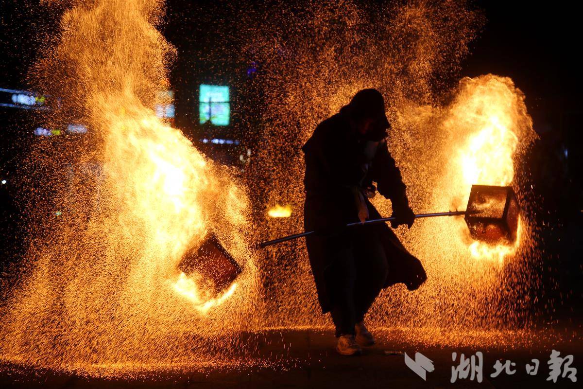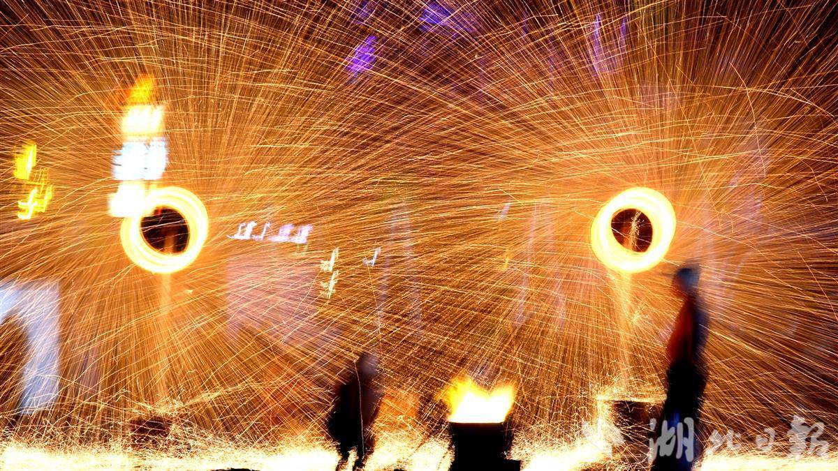 1月4日晚,在十堰市郧阳区新天地文化广场,民间艺人表演非遗“火壶”。连日来,郧阳区新天地文化广场轮番上演非遗“火壶”与“打铁花”。表演现场,万千铁花凌空飞舞,火壶光影灵动闪烁,营造出“流光溢彩不夜天”的盛景,为市民和游客带来了一场精妙绝伦的视觉盛宴,展现出非遗技艺的独特魅力。(视界网 曹忠宏 摄)