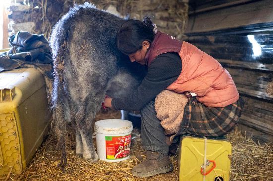 次仁普尺正在挤牛奶。人民网记者 翁奇羽摄