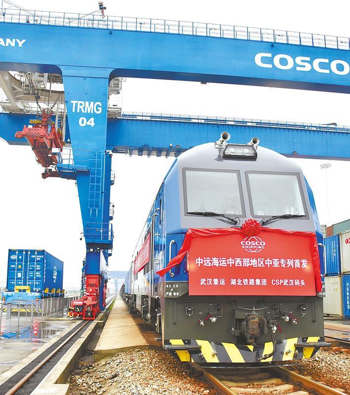武汉—中亚铁水联运集装箱专列从阳逻成功首发。(受访单位供图)