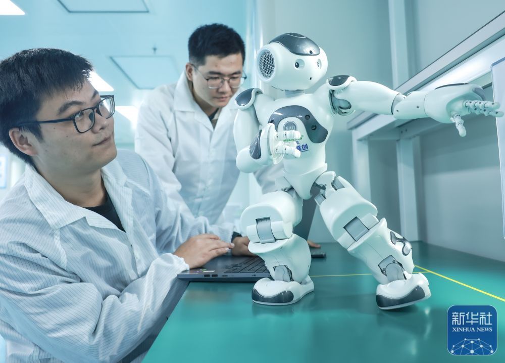 ↑ 1月5日,在盛视科技股份公司华中总部武汉研发中心,技术人员在调试人形机器人。新华社发(赵军摄)