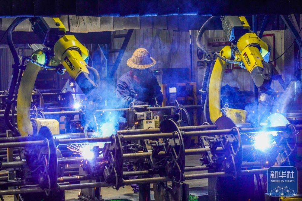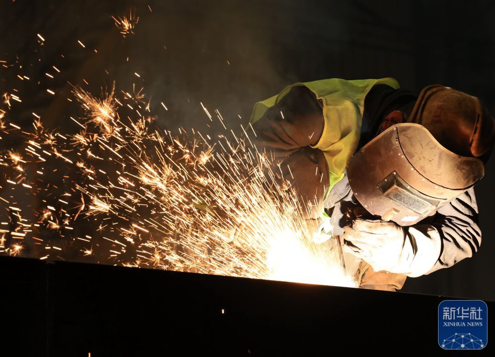 ↑ 1月5日,工人在河北省乐亭县经济开发区一家脚手架企业焊接车间工作。新华社发(刘满仓 摄)