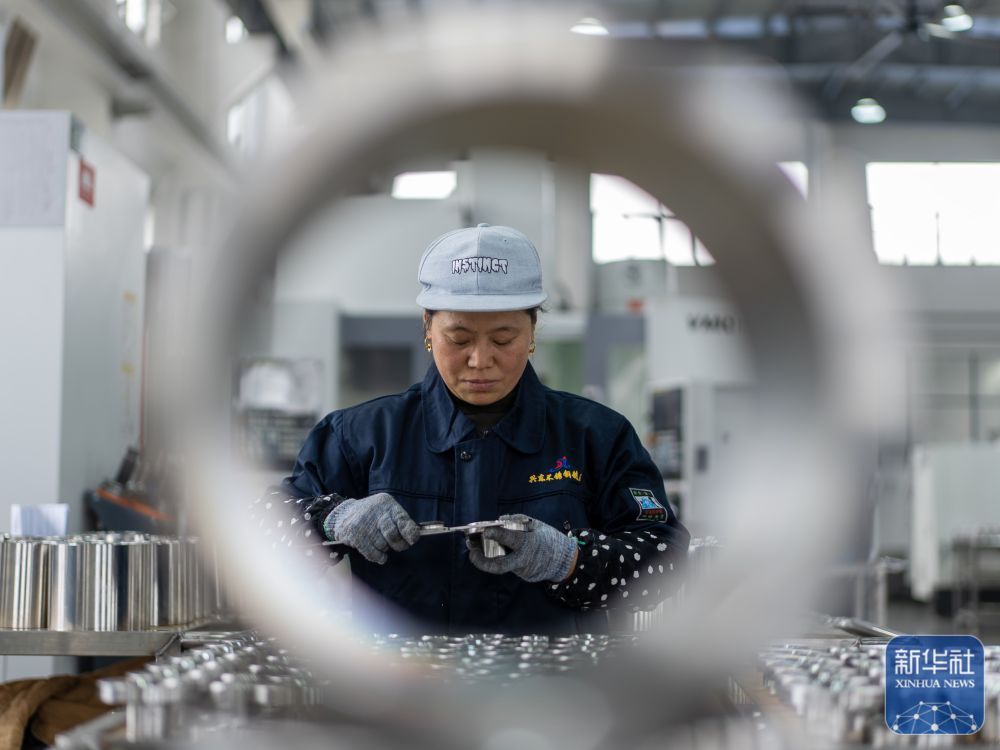 ↑ 1月5日,工人在位于江苏省兴化市戴南镇的江苏唐刘兴东不锈钢有限公司生产车间检测产品。新华社发(周社根摄)