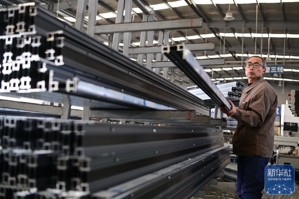 ↑ 1月5日,位于河南省沁阳市的河南兴发幕墙门窗有限公司工人在生产铝合金门窗。新华社发(杨帆摄)