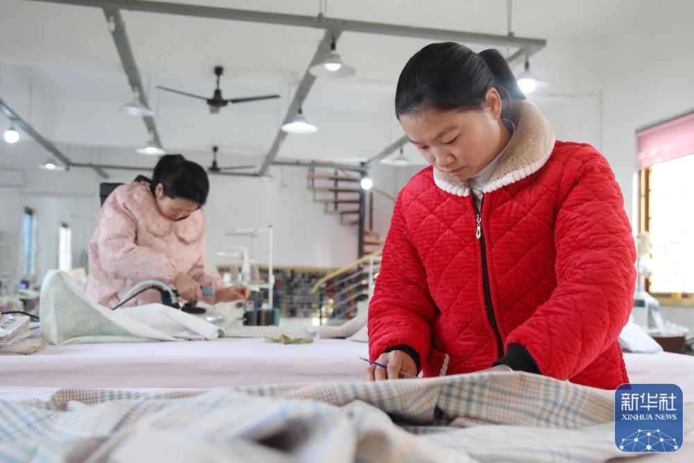 ↑ 1月5日,工人在湖北省十堰市郧阳区柳陂镇龙韵村一家布艺加工厂忙碌。新华社发(曹忠宏 摄)
