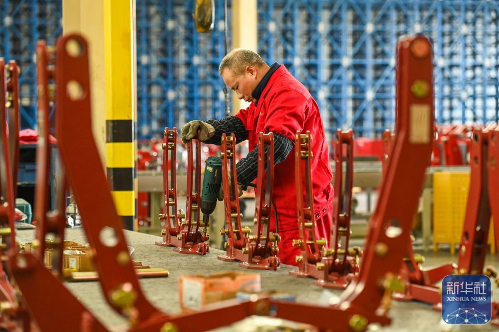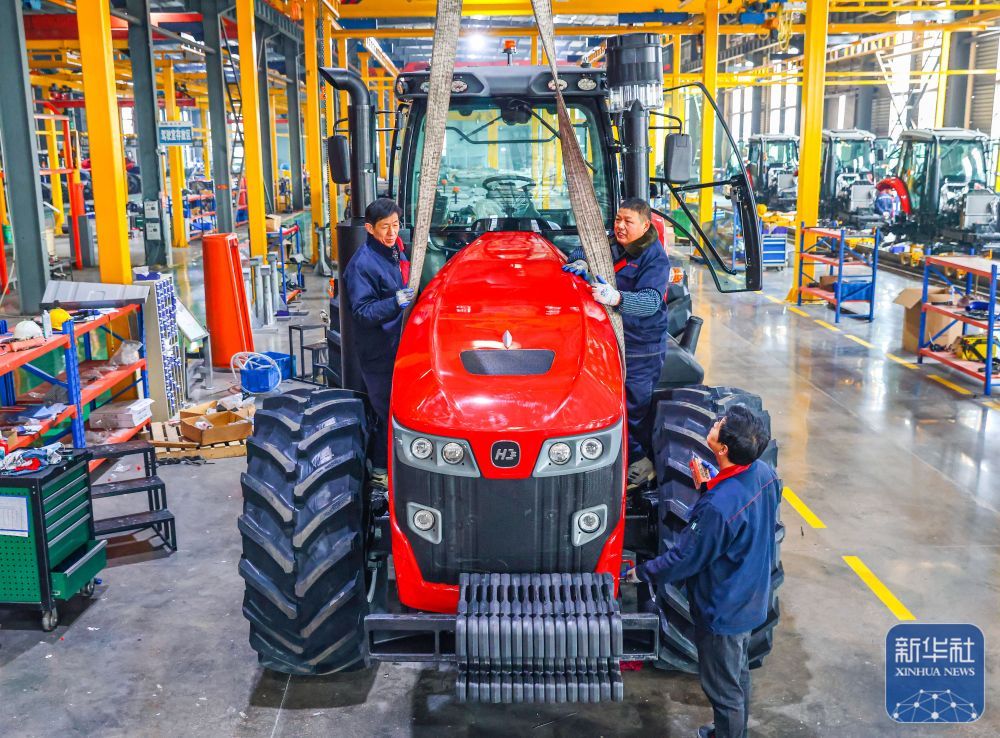 ↑ 1月5日,在位于江苏省扬州市的金世纪(江苏)智能科技有限公司,工人在大马力全动力换挡智能拖拉机生产线上作业。新华社发(任飞摄)
