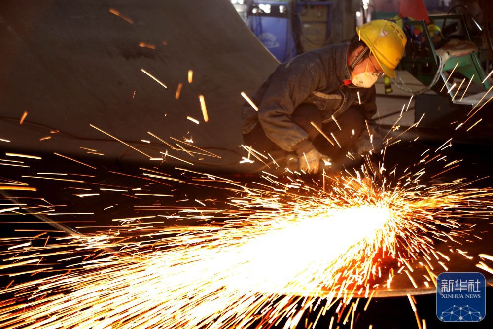 ↑ 1月5日,江苏泰州口岸船舶有限公司厂区内,工人进行打磨作业。新华社发(杨玉岗摄)