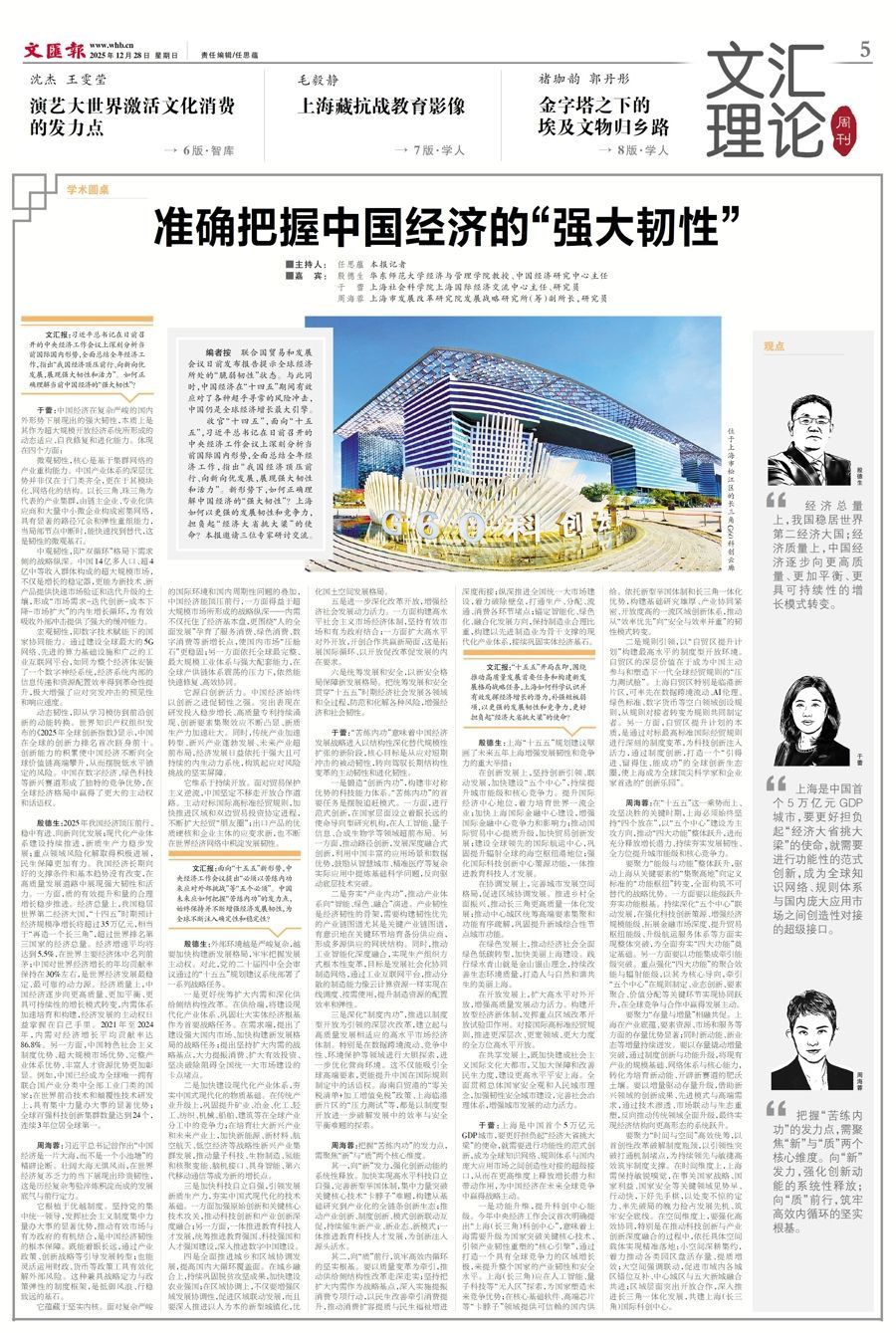 收官“十四五”,面向“十五五”,习近平总书记在日前召开的中央经济工作会议上深刻分析当前国际国内形势,全面总结全年经济工作,指出“我国经济顶压前行、向新向优发展,展现强大韧性和活力”。新形势下,如何正确理解中国经济的“强大韧性”?上海如何以更强的发展韧性和竞争力,担负起“经济大省挑大梁”的使命?本报邀请三位专家研讨交流。