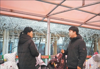 1月5日,河北省曲阳县永宁社区永宁花园小区内,社区干部(右)向居民了解车棚使用情况。