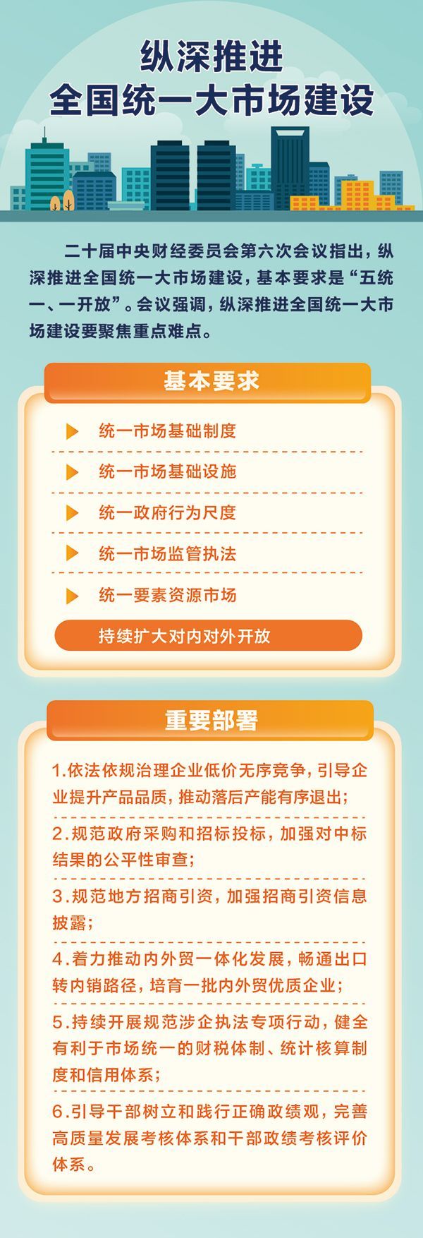 建设全国统一大市场,是党中央从全局和战略高度作出的重大部署,是构建新发展格局、推动高质量发展的基础支撑和内在要求。2025年7月1日,在二十届中央财经委员会第六次会议上,习近平总书记深刻阐明建设全国统一大市场的战略考量,提出“五统一、一开放”基本要求,聚焦重点难点作出重要部署。 孙彤/制图
