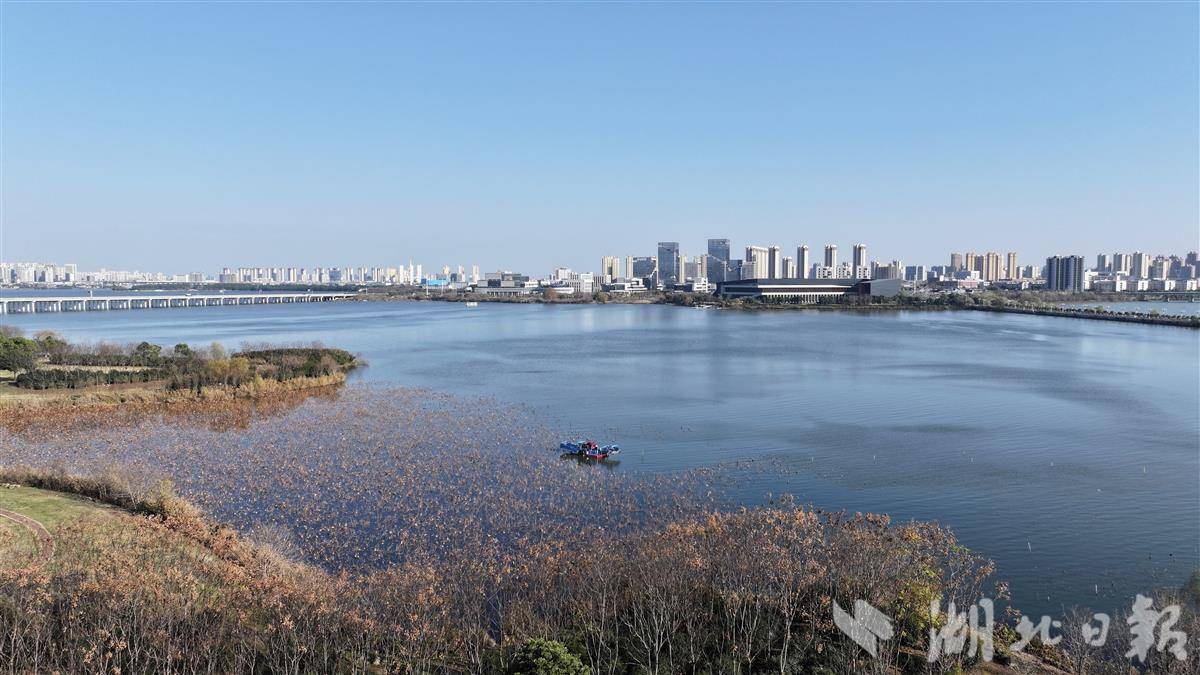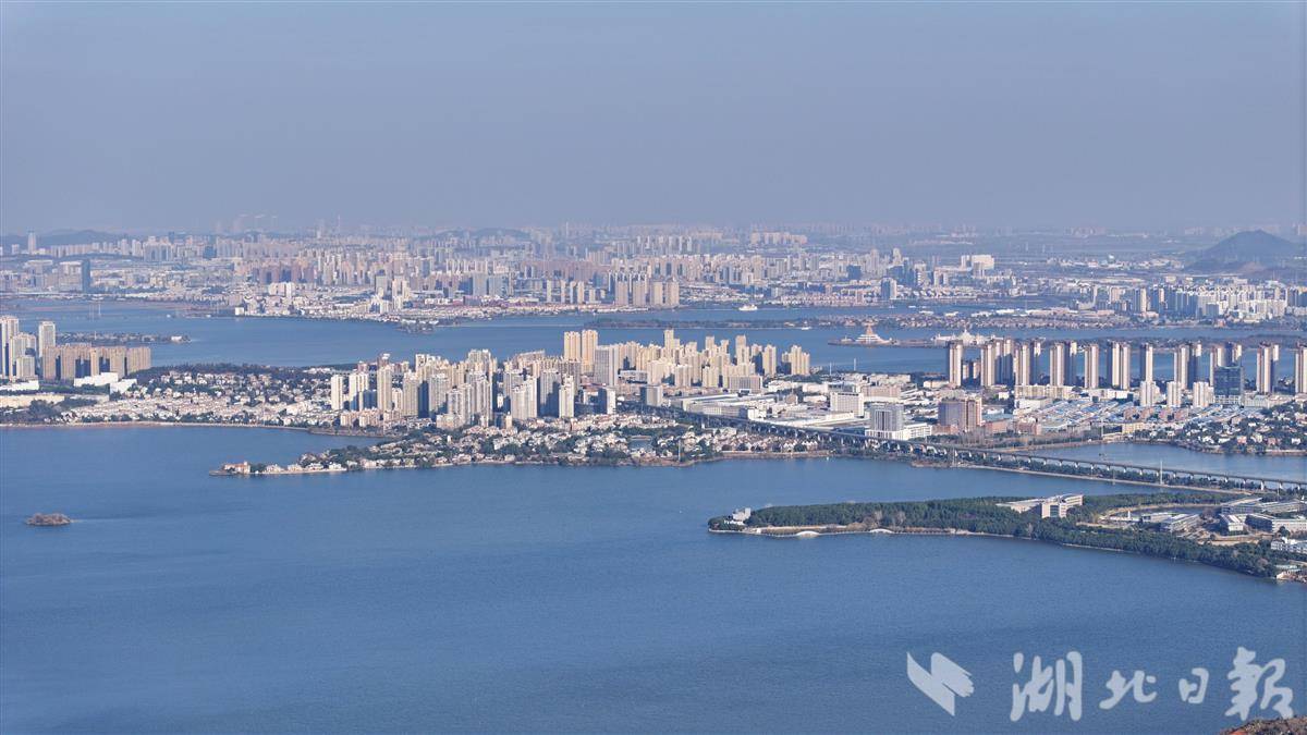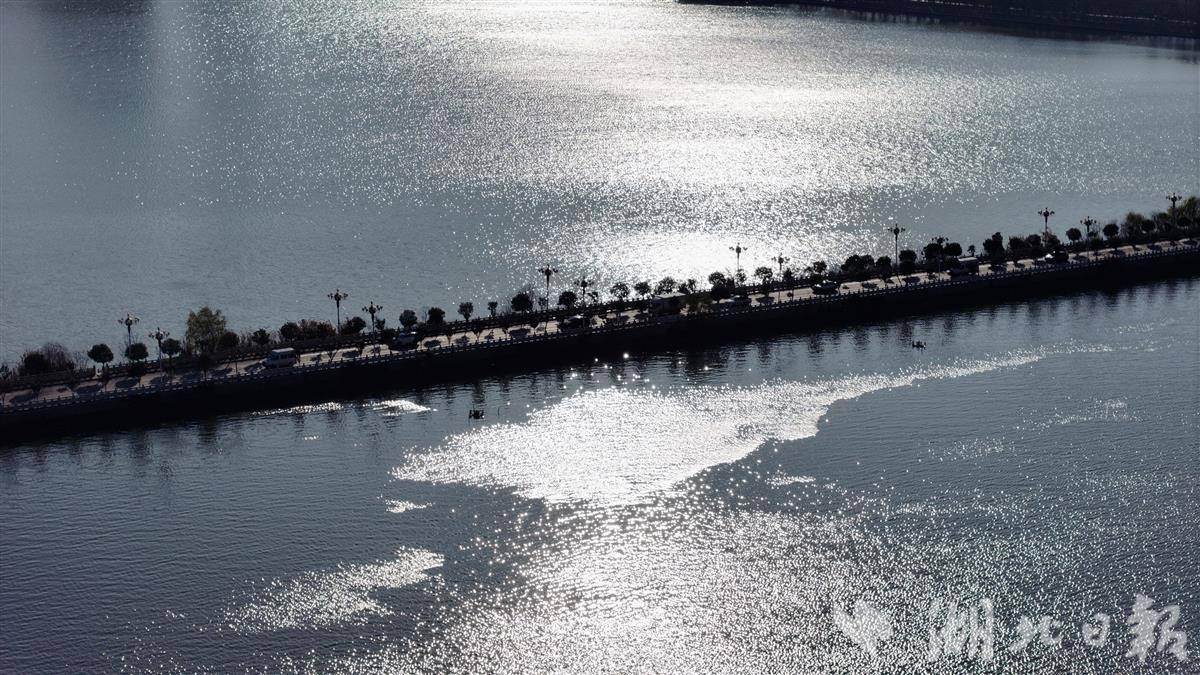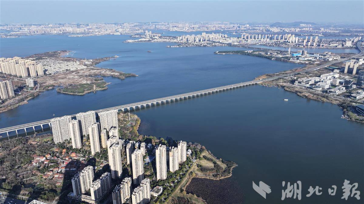 1月6日,武汉晴空万里,清风拂过,空气澄澈。汤逊湖碧波湛蓝,宛如浩渺碧海。四环线江夏段穿梭楼宇、飞跨湖面,桥影映波,恰似海上长虹,勾勒出一幅灵动秀美的江城画卷。(湖北日报全媒记者 陈少哲 摄)