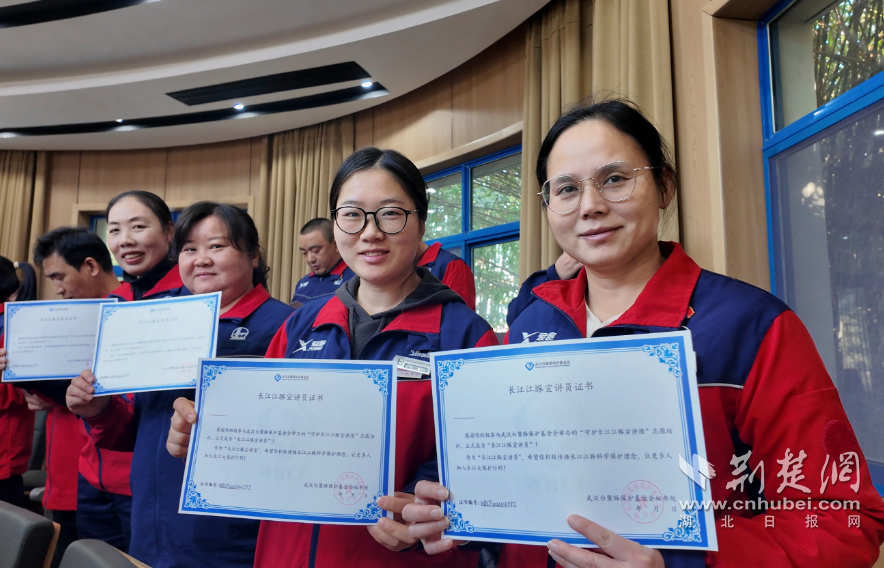 荆楚网(湖北日报网)讯(通讯员 陈卉颖 周硕 王妍)1月6日上午,位于中国科学院水生生物研究所官桥园区内的会场里,来自中国石化湖北石油分公司的40余名加能站志愿者正在接受长江江豚保护知识的科普培训,完成课程后志愿者们将领到一张培训证书,正式成为一名“长江江豚宣讲员”。