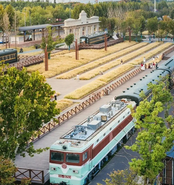 武汉市武昌四美塘铁路遗址文化公园,是一座以“火车”为主题的公园。其前身为武九铁路北环线武昌北站旧址,建于1909年,全国南来北往的货物通过火车汇聚于此。后来随着时代的发展,这个站的功能逐渐被替代。当地盘活低效的铁路遗址,打造成长江百里生态文化长廊核心节点,公园通过复原铁路月台、火车站立面景墙等设施,活化利用工业遗产。园区内改造厂房为双年展展馆,2023年承办第七届武汉设计双年展,融合数字技术打造沉浸式互动体验空间。2024年,公园2号馆设立“人民网・梦幻灵境”AI展演中心,成为华中地区AI科技主题研学基地。2025年,公园内的铁路遗址景观与绿皮车厢元素被写入武汉大学生音乐扶持计划主题曲《星光之下》歌词中 。公园内湖面设有“心”型浮岛与“水下森林”,与铁路元素共同构成生态景观。