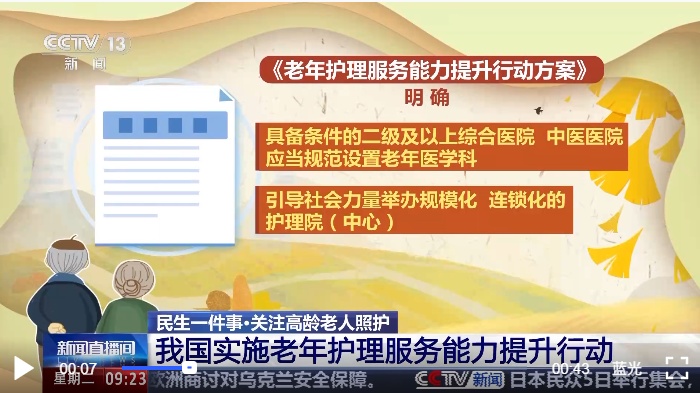 《行动方案》明确,具备条件的二级及以上综合医院、中医医院应当规范设置老年医学科;同时,引导社会力量举办规模化、连锁化的护理院(中心)。