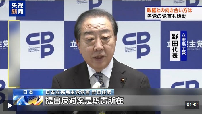 日本立宪民主党党首 野田佳彦:高市政权关于“台湾有事”和“拥核”的言论缺乏考虑,让人感到危险。作为最大的在野党,提出反对案是职责所在。