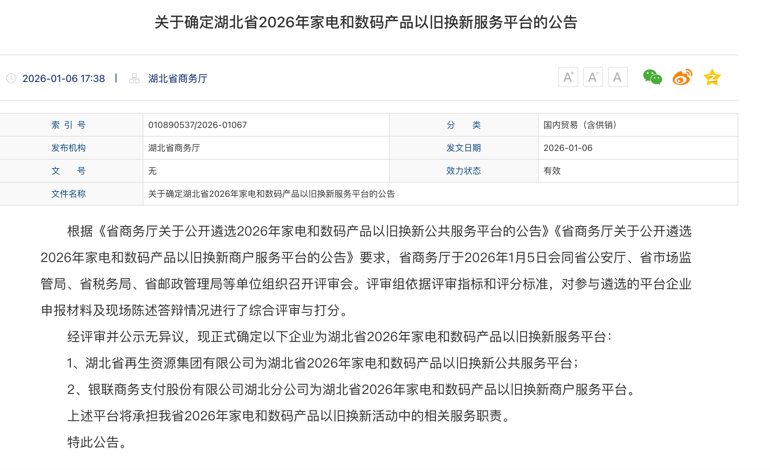 湖北日报讯(记者李朝霞、通讯员沈商轩)1月7日从省商务厅获悉,我省正式确定湖北省再生资源集团有限公司、银联商务支付股份有限公司湖北分公司为湖北省2026年家电和数码产品以旧换新服务平台。其中,湖北省再生资源集团有限公司为公共服务平台,银联商务支付股份有限公司湖北分公司为商户服务平台。