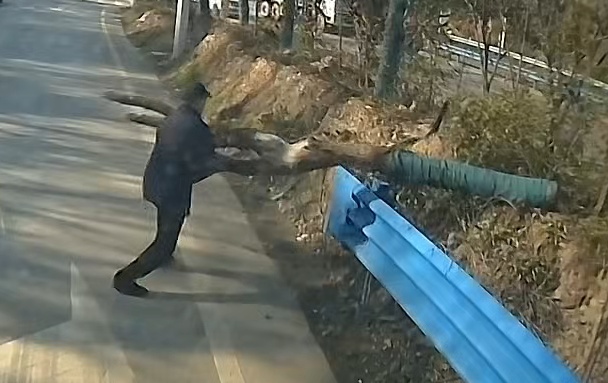在清理的过程中,由于树木过大,张波先是用力将横倒的树木抬到了一旁,然后使劲将树木往种植地中间推,防止树木滑落。担心会滑落,张波再次上前稳了稳树枝,仅仅一分钟,便清理了道路的安全隐患。