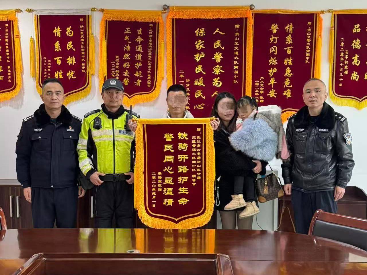 湖北日报讯(记者张竞恒、通讯员黄一燕、尤巧玲)1月6日上午,武汉市公安局洪山区分局交通管理大队的办公室里暖意融融。一面印着“铁骑开路护生命,警民同心显温情”的鲜红锦旗,被市民李先生一家三口郑重送到快骑队员胡磊手中。一句句真挚的感谢的背后,是元旦当天那场与时间赛跑的紧急救援。