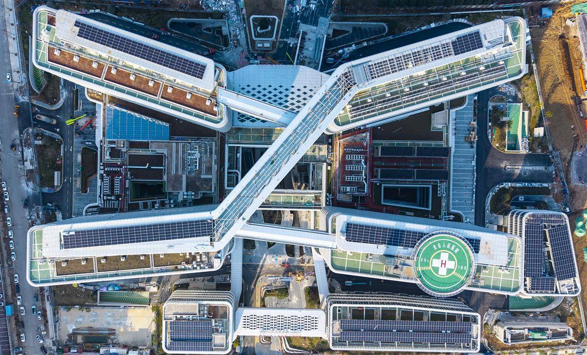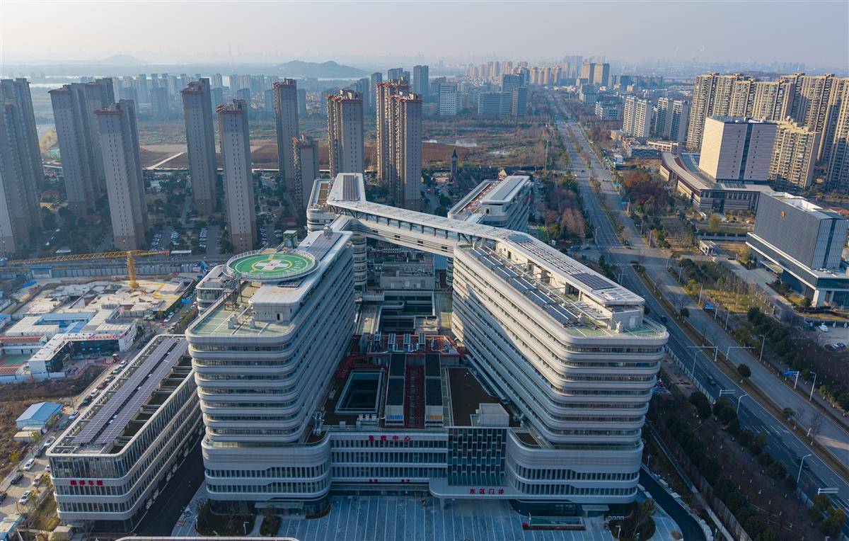1月7日,光谷人民医院(武汉大学中南医院光谷院区)项目现场,主体建筑已完成外立面施工,正在进行内部装修和设备安装。作为武汉东湖高新区重要民生工程,光谷人民医院位于花山生态新城核心区,总建筑面积约24.4万平方米,规划床位1000张。项目包含4栋住院楼、2栋综合医疗楼、行政楼、发热门诊及立体停车楼等,屋顶还设有停机坪,为紧急救援提供保障。据悉,光谷人民医院预计2026年投入使用,建成后将覆盖高新区约120万常住居民的医疗健康需求。加上现有7家三甲医院,光谷区域医疗服务体系将更完善。(湖北日报全媒记者 魏铼 摄)