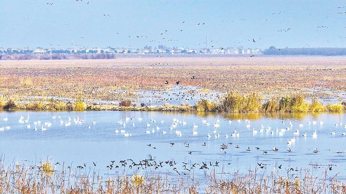 每年秋冬,洪湖湿地都会迎来一群远道而来的“客人”。今冬以来,这里已记录到水鸟38种、总数超过7万只,其中国家一级保护动物白鹤、青头潜鸭等珍贵身影频频出现。