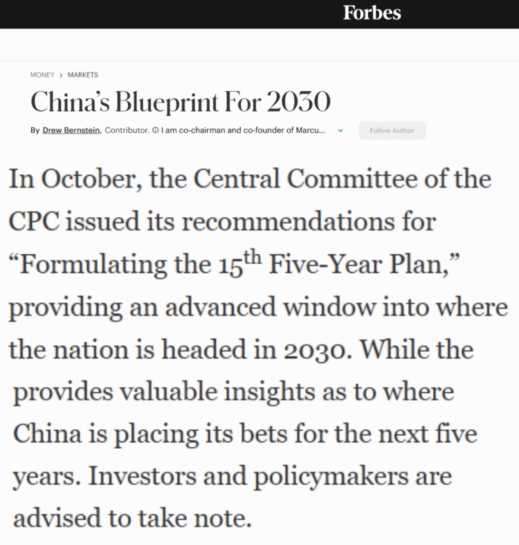 美国财经杂志《福布斯》网站近日刊文称,去年10月,中国发布了《中共中央关于制定国民经济和社会发展第十五个五年规划的建议》,这扇提前开启的窗口让外界得以窥见中国2030年的发展蓝图。同时,这份规划建议为观察中国未来五年的战略布局提供了宝贵线索。