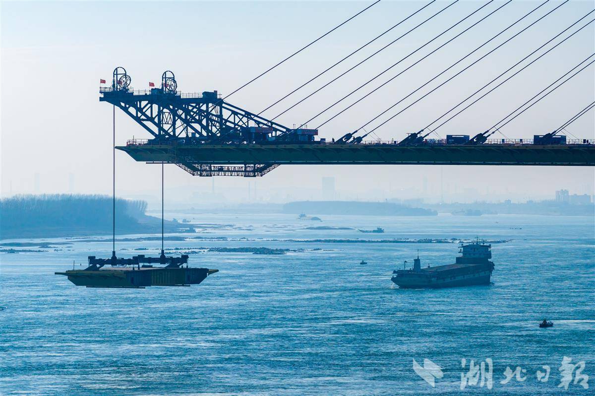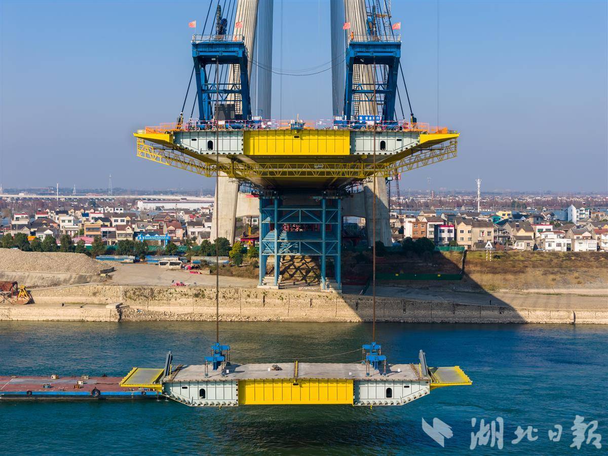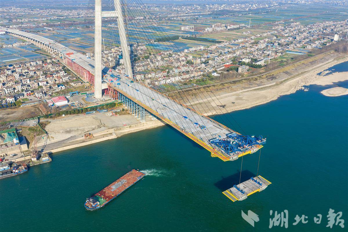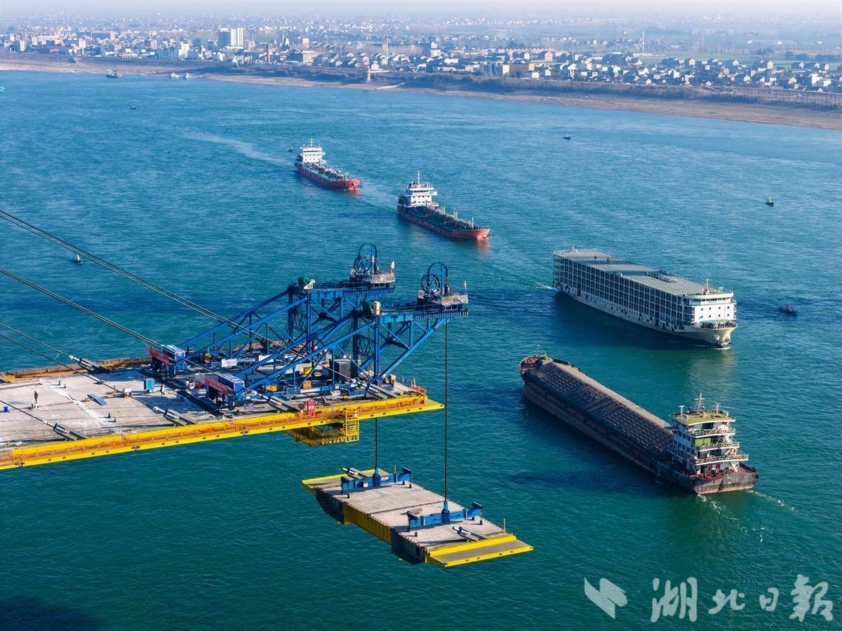 1月7日,枝江长江大桥施工现场一派繁忙,钢箱梁吊装作业有序推进。