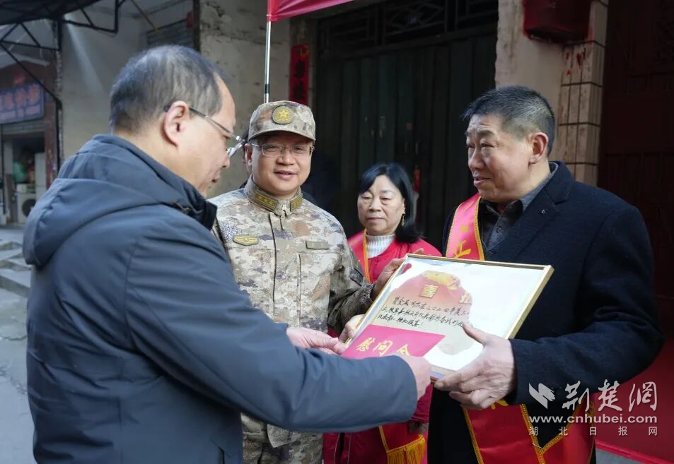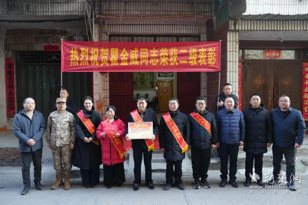 荆楚网(湖北日报网)讯(通讯员楚豫)1月7日,随州市曾都区东城街道小东关社区锣鼓喧天,由曾都区政府、区人武部、区退役军人事务局和东城街道组成的慰问组,为荣获二级表彰的现役军人瞿金威家庭送去立功喜报。