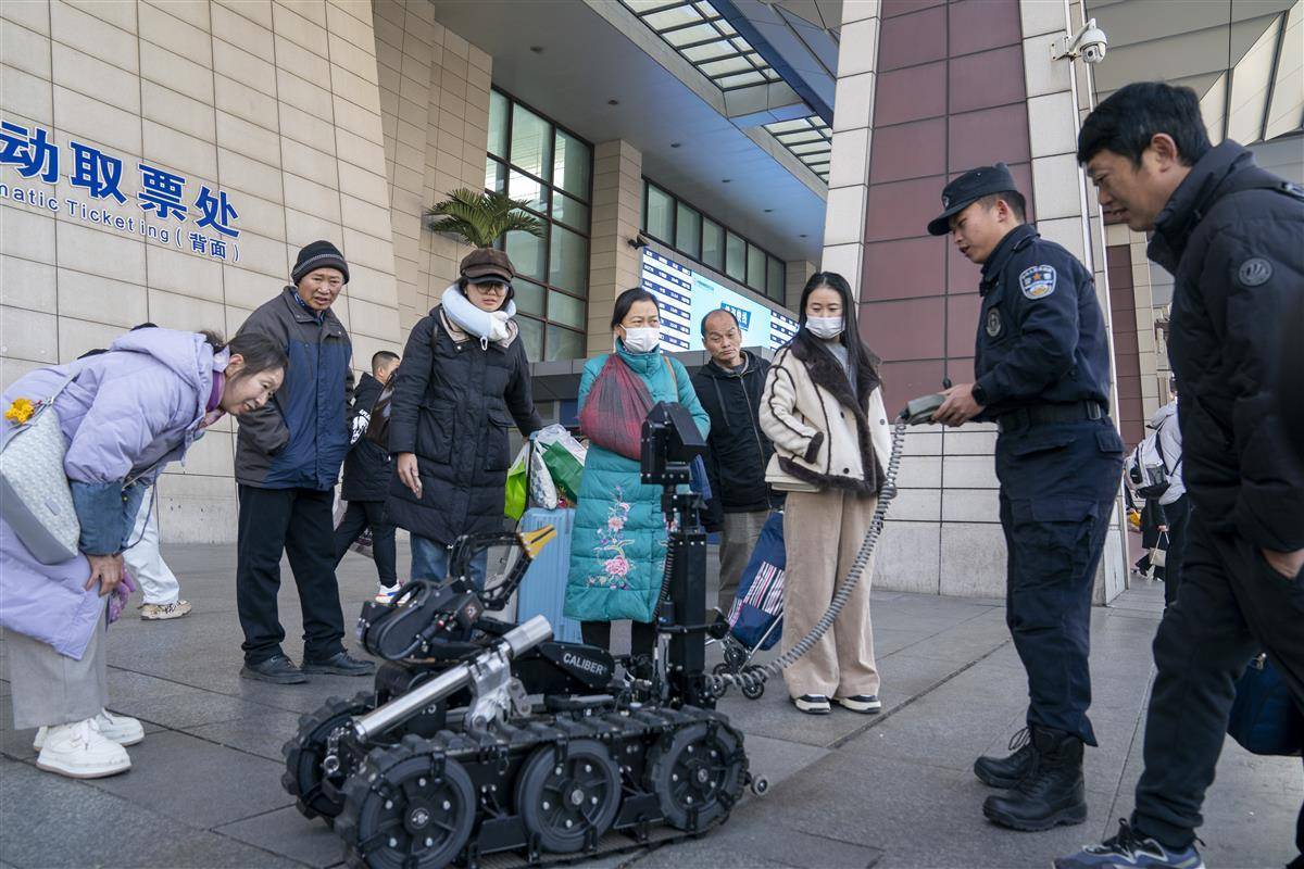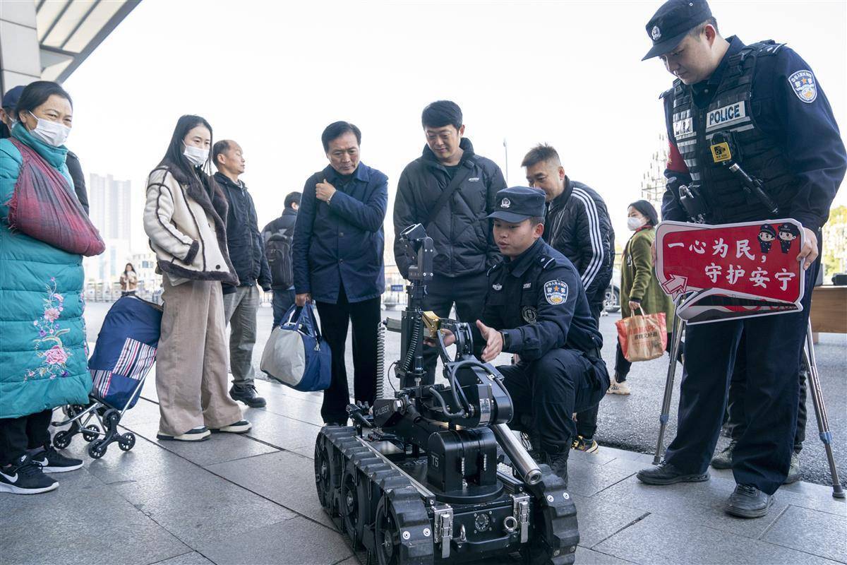 武昌火车站站前广场,武汉铁路公安处联合武昌区公安分局、武汉客运段等单位开展警营开放日活动。图为民警为旅客们介绍排爆机器人。