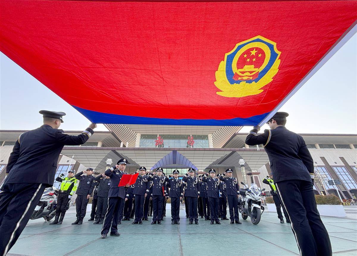 1月8日,武昌火车站站前广场,公安民警辅警面对警旗重温入警誓词,开展警营开放日活动。当日,在第六个中国人民警察节来临之际,武汉铁路公安处联合武昌区公安分局、武汉客运段等单位在武昌站开展“爱车护路进车站,共庆人民警察节”警营开放日活动。活动现场,民警为旅客展示警务技能演练、警用装备和警犬表演,让旅客近距离了解警营生活。同时开展贴近生活的铁路普法宣传,宣传电信网络诈骗的手段提醒旅客保护好财产以防被骗,进一步增强铁路交通安全意识和自我防护能力。(湖北日报全媒记者 魏铼 通讯员 陈诚 杨家乐 摄)