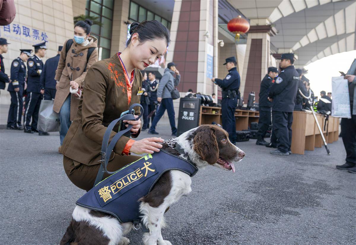 武昌火车站站前广场,武汉铁路公安处联合武昌区公安分局、武汉客运段等单位开展警营开放日活动。图为高铁乘务员与警犬互动。