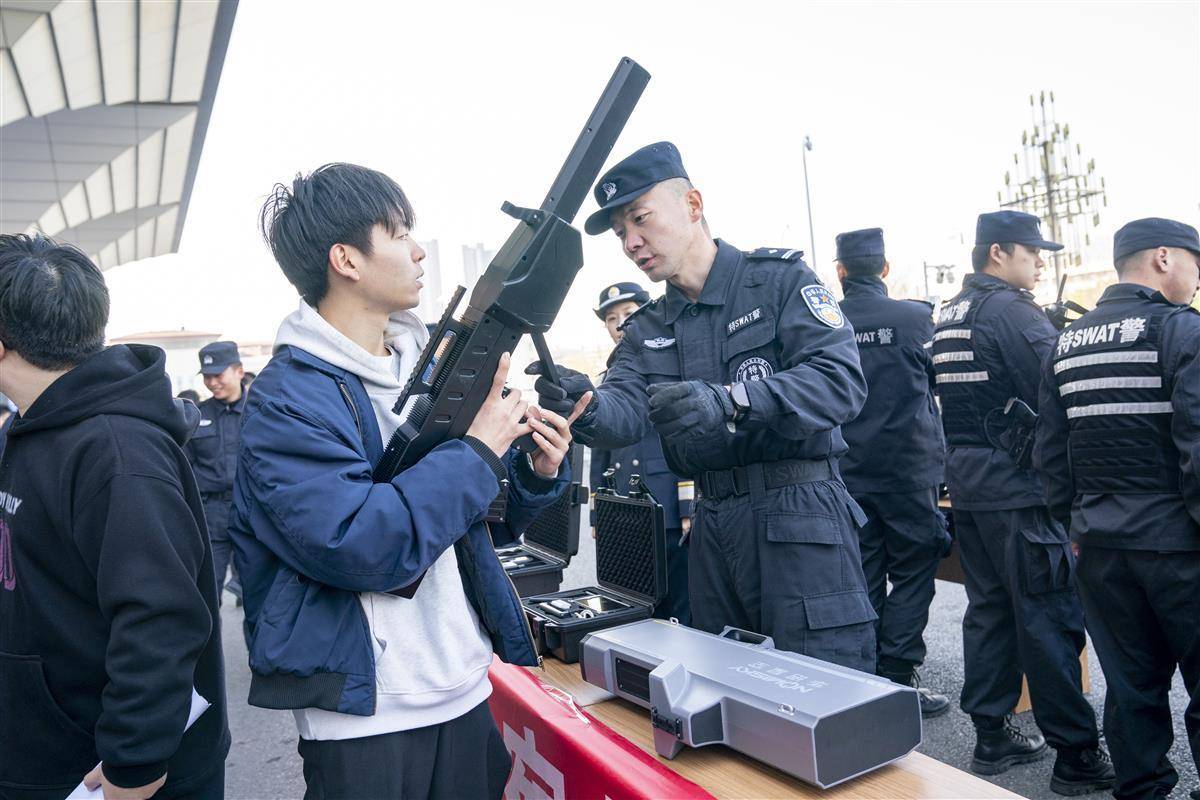 武昌火车站站前广场,武汉铁路公安处联合武昌区公安分局、武汉客运段等单位开展警营开放日活动。图为民警为旅客们介绍无人机反制装备。