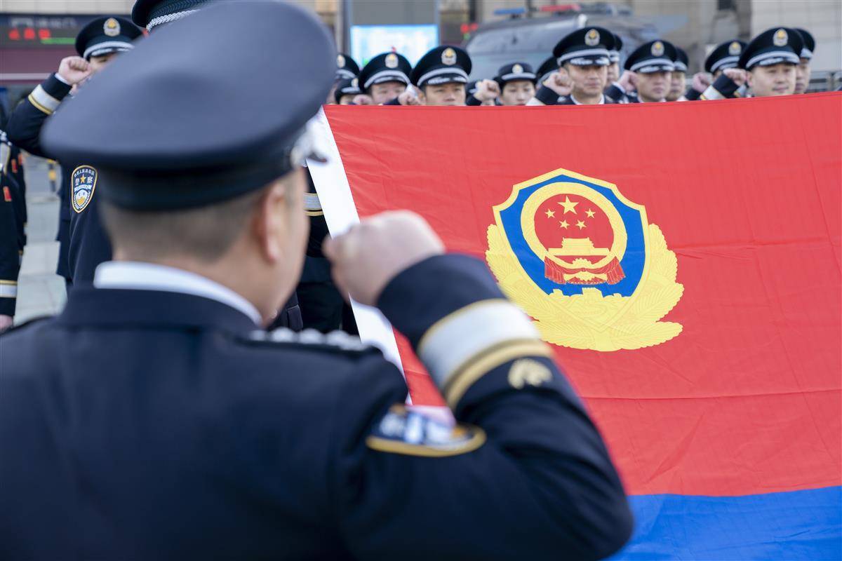 1月8日,武昌火车站站前广场,民警辅警面对警旗重温入警誓词,开展警营开放日活动。