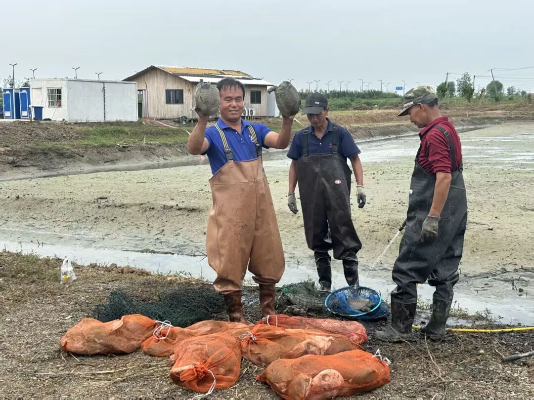 在东风农场甲鱼养殖户黄国亮的基地里,工人们正忙着起捕甲鱼,一只只色泽鲜亮、肉质紧实的甲鱼被打捞上岸,一派丰收忙碌的喜人景象。