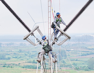 安徽省滁州市柳巷镇,检修人员在100多米的高空进行检修作业,确保“西电东送”特高压大动脉安全稳定运行。