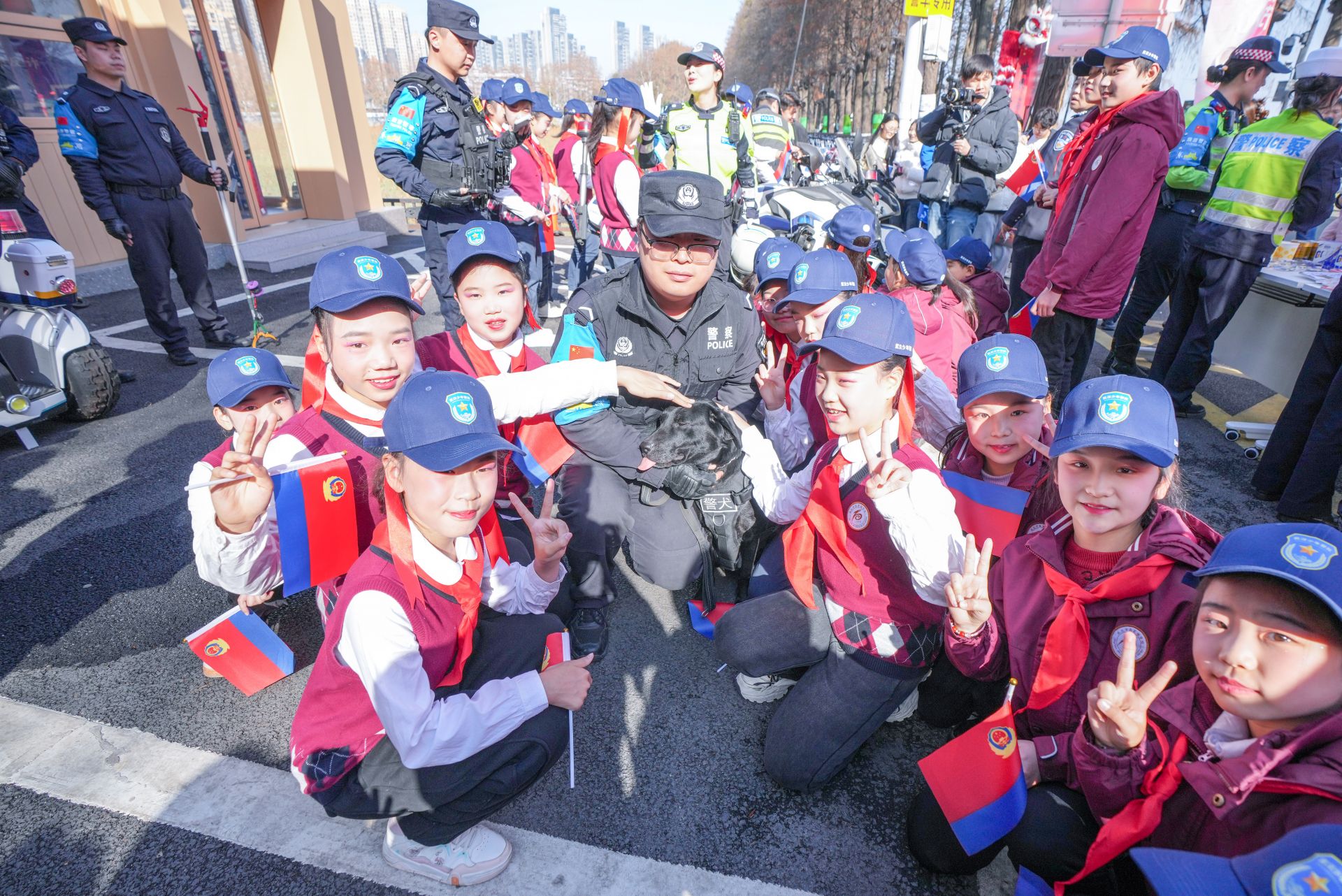 活动现场,警用装备展示区最先吸引孩子们和路过游客的目光。警务机器犬灵活走位,无人机低空盘旋,平衡车上的民警帅气穿梭。孩子们不仅能看,还能亲手触摸防暴头盔、试戴警用装备。“好酷!这个机器狗真的能抓坏人吗?”五年级学生刘锦妍好奇地发问,特警队员笑着演示了它的巡逻功能。