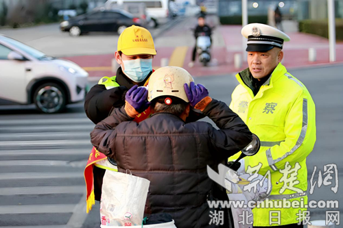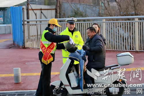 “一日交警”活动体验者对为未佩戴头盔的电动车驾驶员带上头盔并进行“一盔一带”的宣传。通讯员 供图