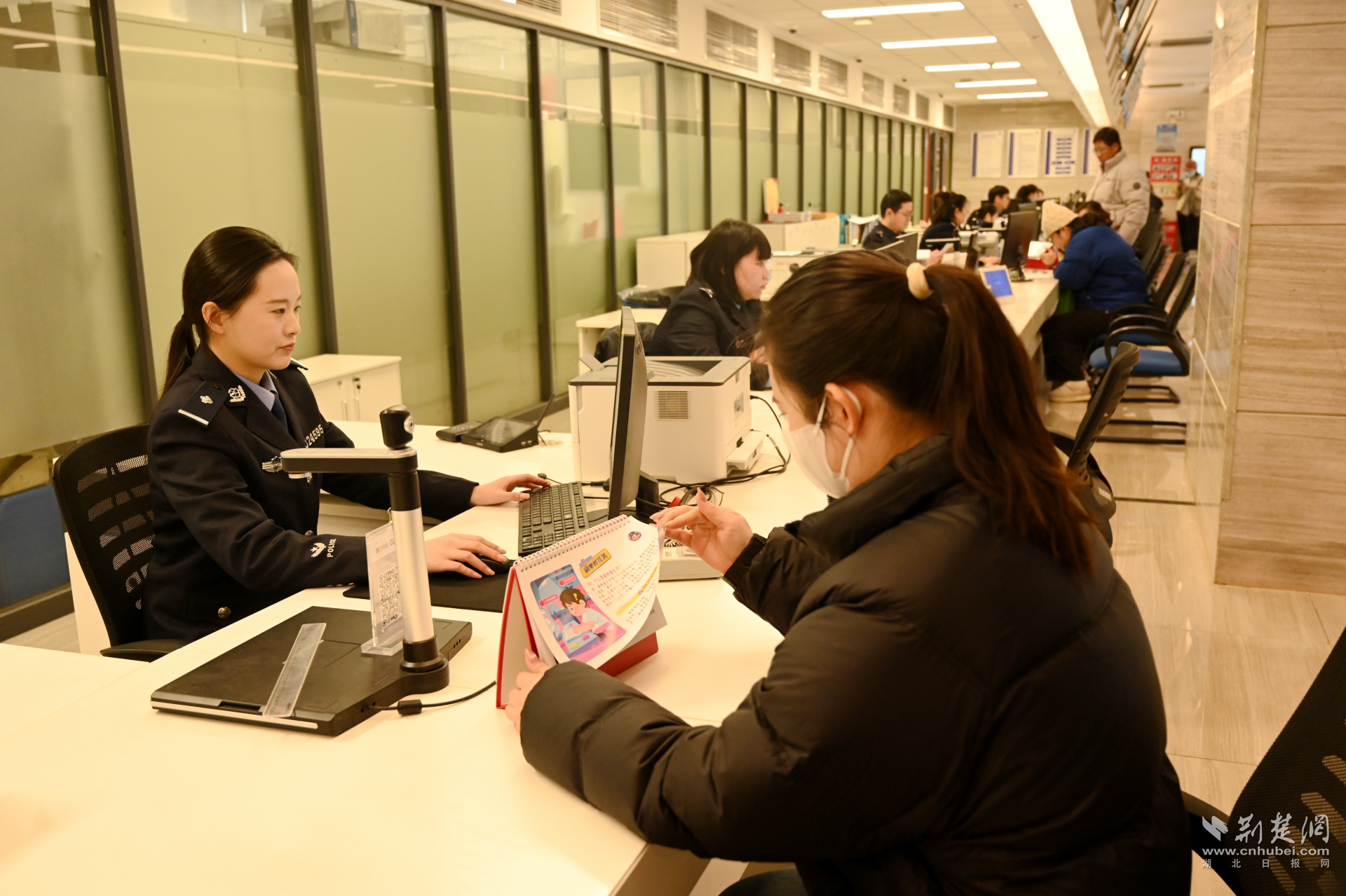 “早上好!”清晨的政务服务大厅刚刚敞开大门,政务服务大队民警和辅警早已准备就绪,为前来办理业务的群众宣讲快捷便民政策。在二楼公安办证窗口,一本本由江岸公安民警设计的反诈台历整齐摆放在台面上,吸引了排队市民的目光。台历巧妙地将“冒充公检法”“养老诈骗”等常见骗局融入日期页中,化作一份“每日防骗贴士”。不少市民随手拿起翻看,等候的间隙里,反诈知识已悄然入眼入心。