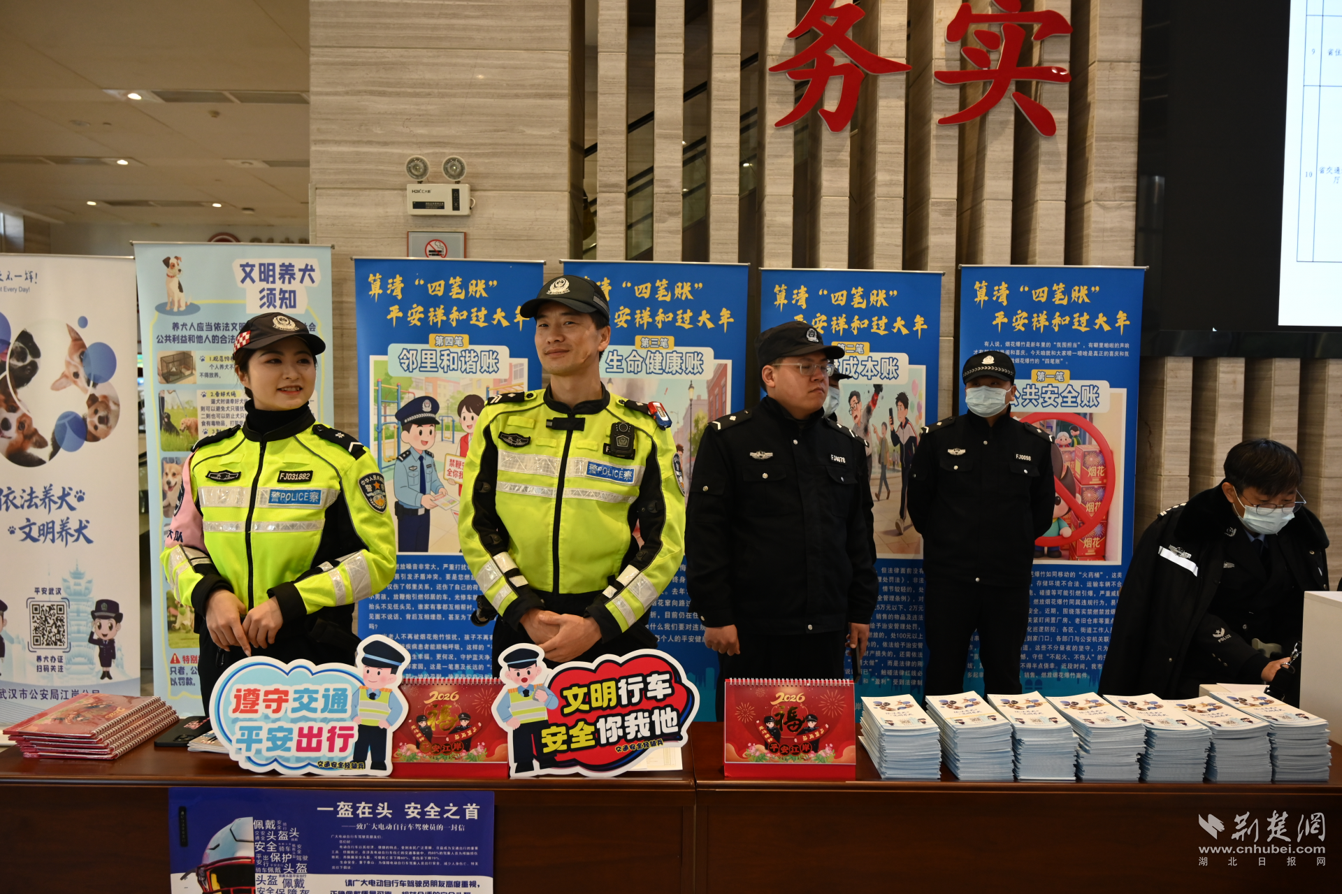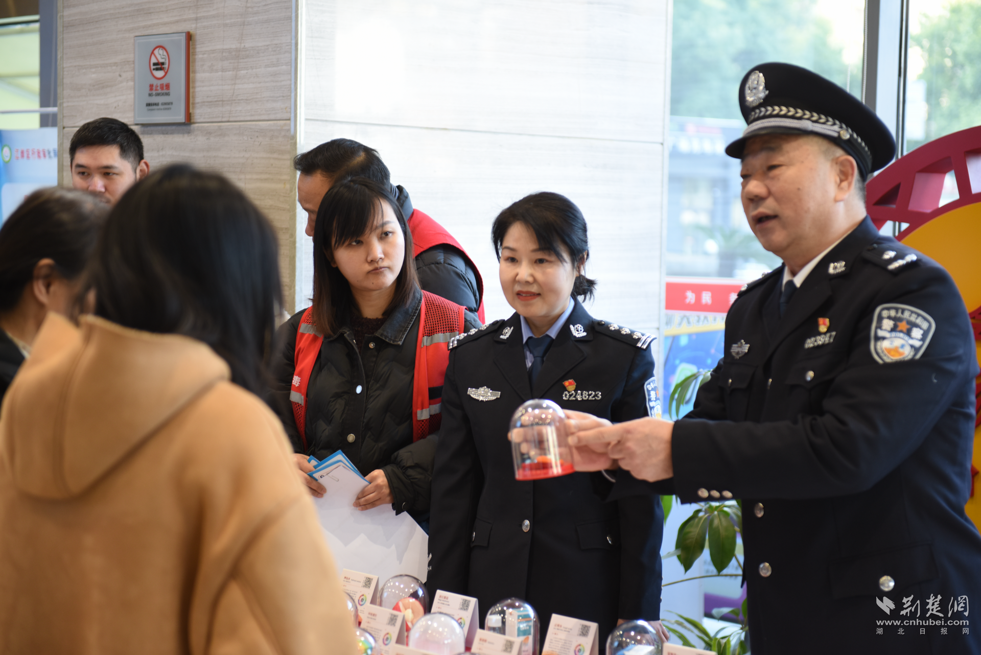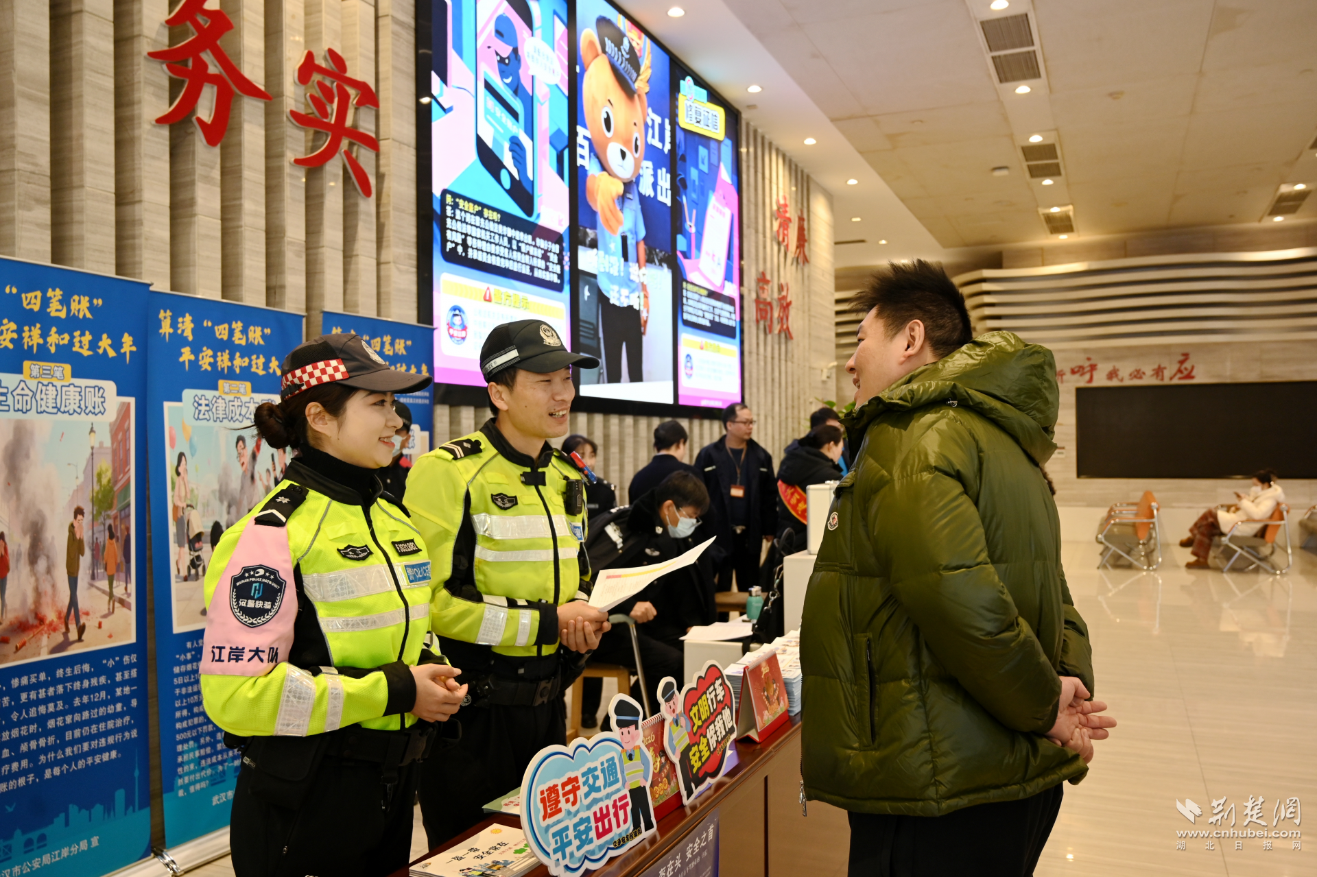 大厅内,五六个主题鲜明的宣传展台依次排开,民警与市民热络交流,笑语阵阵,绘出一幅警民共筑平安的生动画面。
