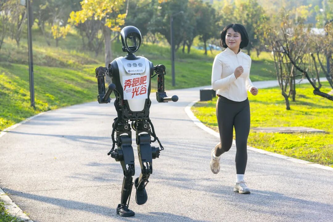 光谷中央生态大走廊,人形机器人沿着步道奔跑,为即将举行的光谷马拉松预热助威。(魏铼|摄)
